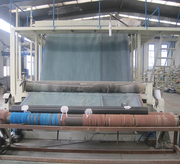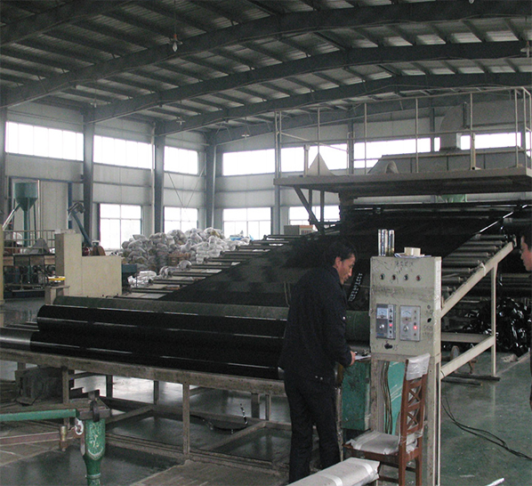 EVA防水板的生產(chǎn)工藝采用先進(jìn)的兩段共擠單摞桿擠出法生產(chǎn), 由原料樹(shù)脂EVA加入增強劑、抗氧劑,經(jīng)加熱熔融、塑化、擠出成形、牽引后形 成的板材,也可與穿好吊帶的土工織物(信號層)熱合成一體,形成復合防水板, 也可采用擠出壓延法,即將樹(shù)脂擠出機熔融塑化,從機頭狹縫??跀D出熔融狀的 片坯與吊帶融合一體,經(jīng)輥筒壓延冷卻成光膜,或與穿好吊帶的土工織物融合一 體,經(jīng)輥筒壓延冷卻成復合防水板材。